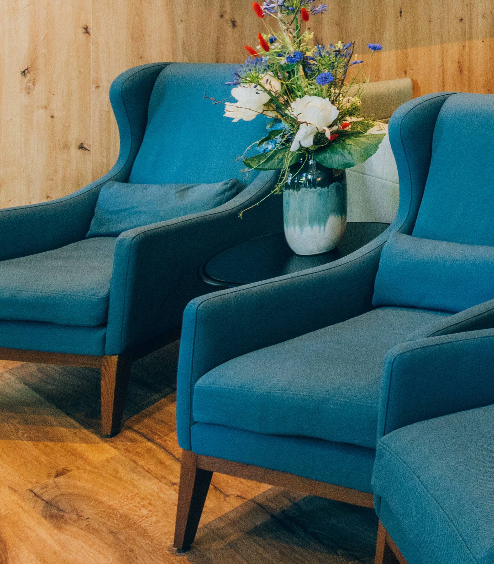 Der Chill-Bereich für Privatpatienten verbindet Funktionalität mit gehobener Ausstattung. Die Abtrennung zur Teeküche und Essensausgabe erfolgt durch Sichtschutzelemente mit Lamellen in Ast-Eiche-Optik – ein wiederkehrendes Gestaltungselement, das für visuelle Kontinuität sorgt. Die Teeküche selbst präsentiert sich mit Oberflächen in Taupe und einer U-förmigen Arbeitsfläche. Hier wurden alle technischen Komponenten elegant integriert: Kalt-/Warmplatte mit Hustenschutz, Ambiente-Beleuchtung, Kaffeemaschine, Kühlschränke, Heißwasserzapfstelle und Wasserspender fügen sich nahtlos in die Arbeitsplatte ein.