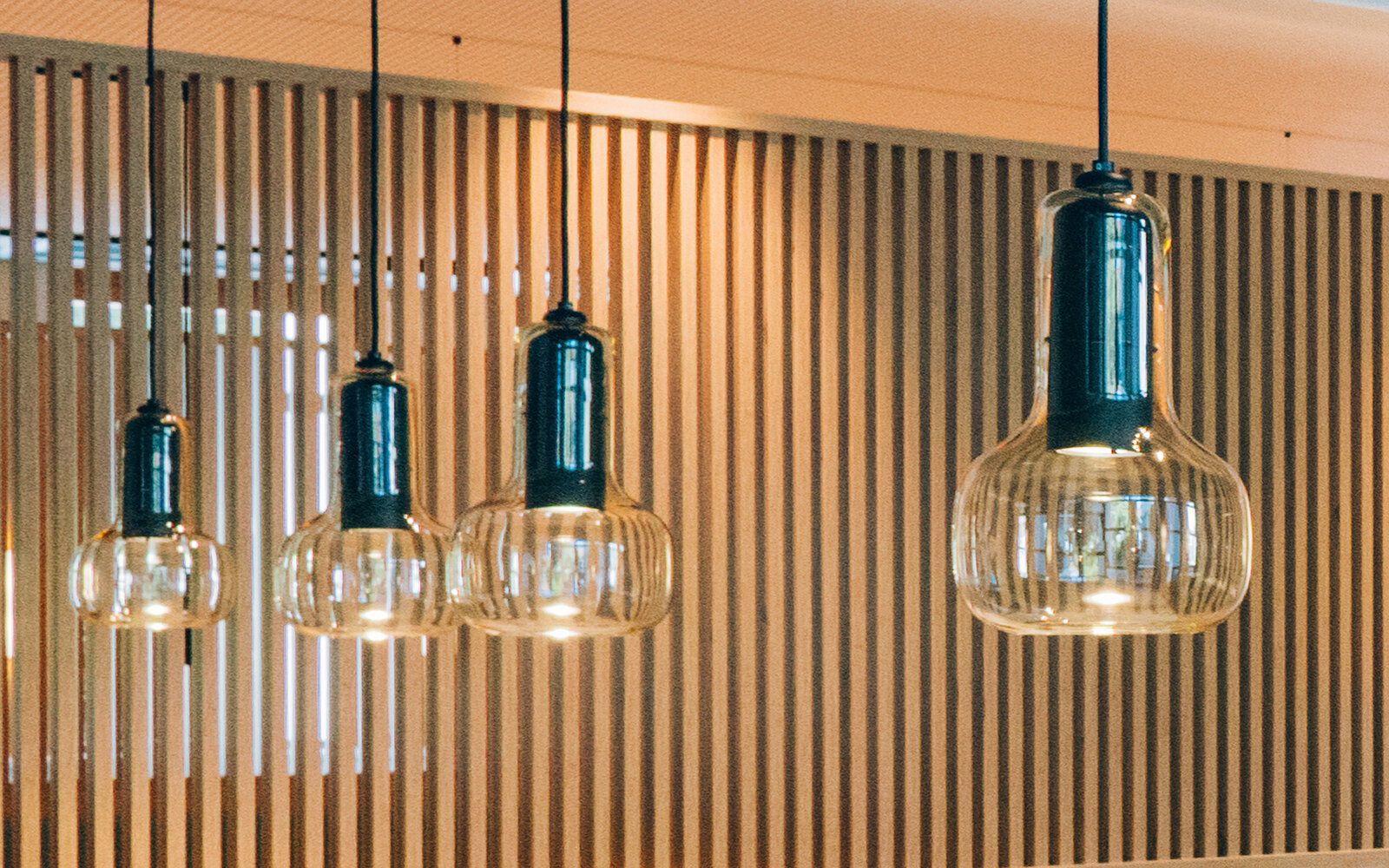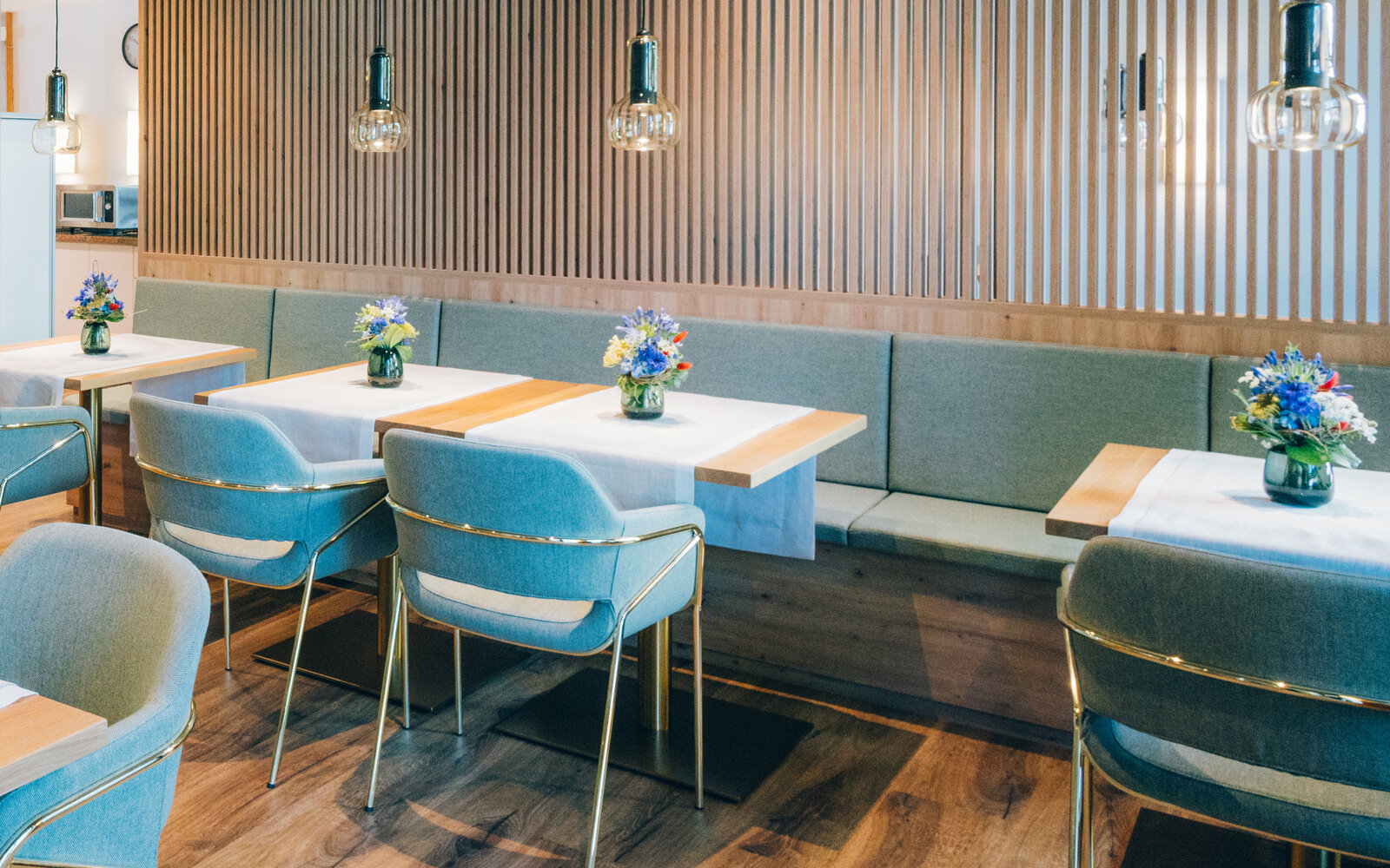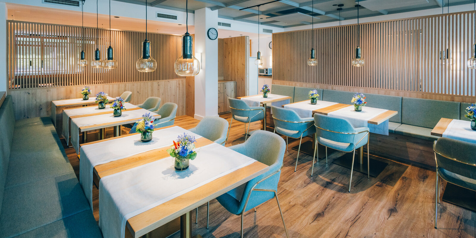 Im Restaurantbereich schaffen ebenfalls Sichtschutzelemente mit Lamellen in Ast-Eiche-Optik eine intime Atmosphäre, ohne den Raum zu verschließen. Die Sitzbänke, im bereits eingesetzten Ast-Eiche-Dekor versehen, sind mit hochwertigen Polsterauflagen und Rückenpolstern ausgestattet – eine Kombination aus natürlicher Materialität und Komfort. Besonders durchdacht: Die Schiebetüren verschwinden im geöffneten Zustand vollständig in Wandtaschen und ermöglichen so eine flexible Raumnutzung je nach Bedarf.